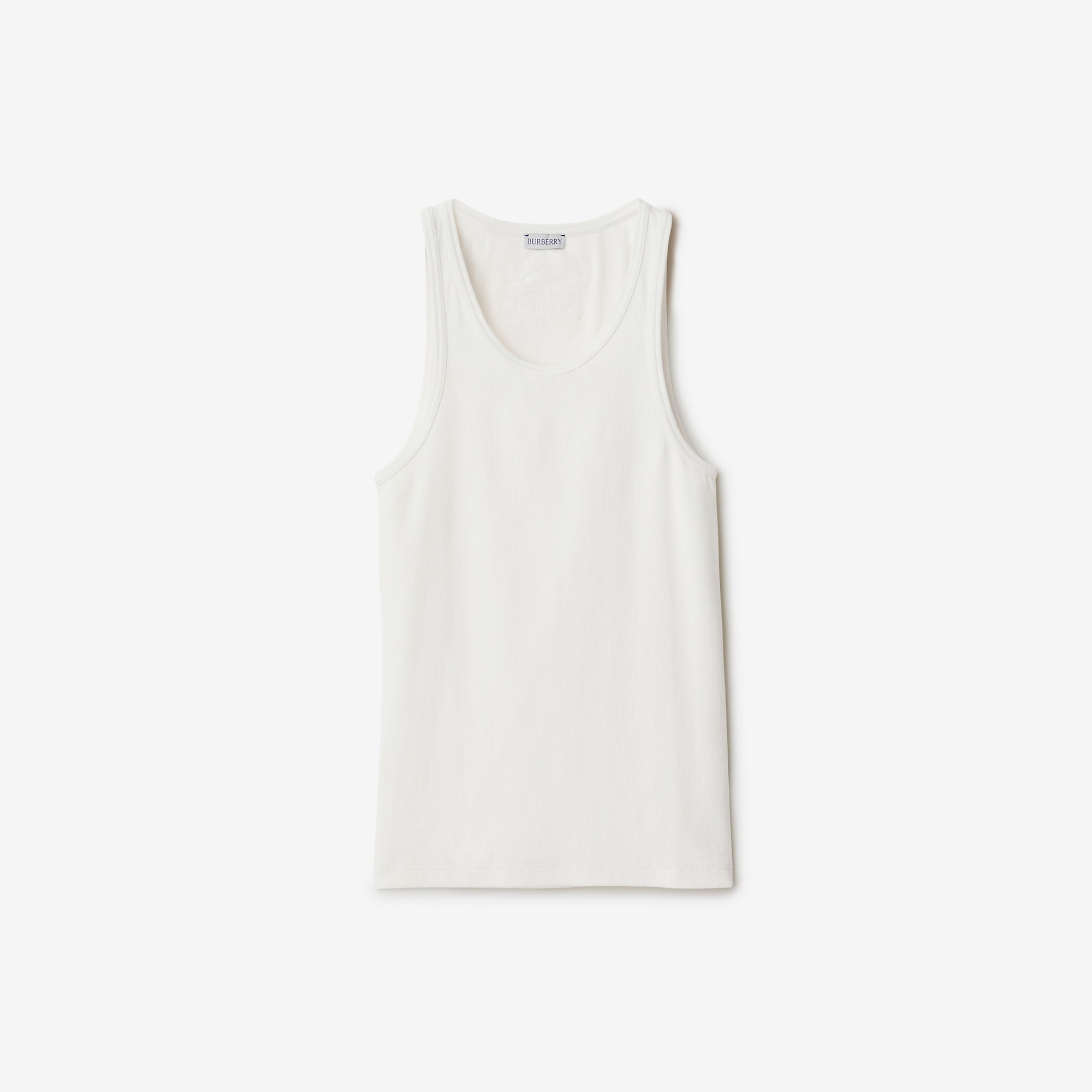 Product Details A rib-knit tank top in stretch cotton, appliqued with a tonal Equestrian Knight Design. The style is cut to a slim fit. Part of Burberry Classics, wardrobe foundations with a unique Burberry slant. - Appliqued Equestrian Knight Design at back - Slim fit: this style is cut to a fitted silhouette. Fits true to size, take your normal size. - Machine wash - Item 80882741 Size & Fit - Length: 67cm/26.4in (size UK M) - Model’s height: 188cm/6ft 2in. Model wears size UK L Fabric & Care - 95% cotton, 5% elastane* - Trim: 100% cotton - *100% of the cotton in the main material is organic - Made in Portugal