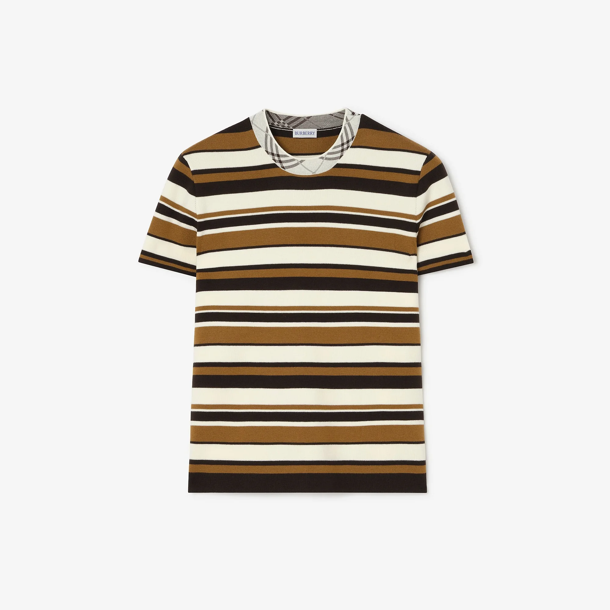 Product Details Slim fit: this style is cut to a fitted silhouette. Fits true to size, take your normal size. Bold colour blocking and a slim silhouette define this Summer 2026 T‑shirt. Made in Italy from a lightweight wool blend, the short‑sleeved style is knitted with light hazelnut‑brown and charred‑brown stripes. The design is finished with our Burberry Check at the crew neckline. - Item 81250451 Size & Fit - Slim fit: this style is cut to a fitted silhouette. Fits true to size, take your normal size. - Length: 64.5cm/25.4in (size UK M) - Model’s height: 186cm/6ft 1in. Model wears size UK M Fabric & Care - 95% wool, 4% polyamide, 1% elastane - Trim: 92% cotton, 5% polyamide, 3% elastane - Specialist dry clean - Made in Italy