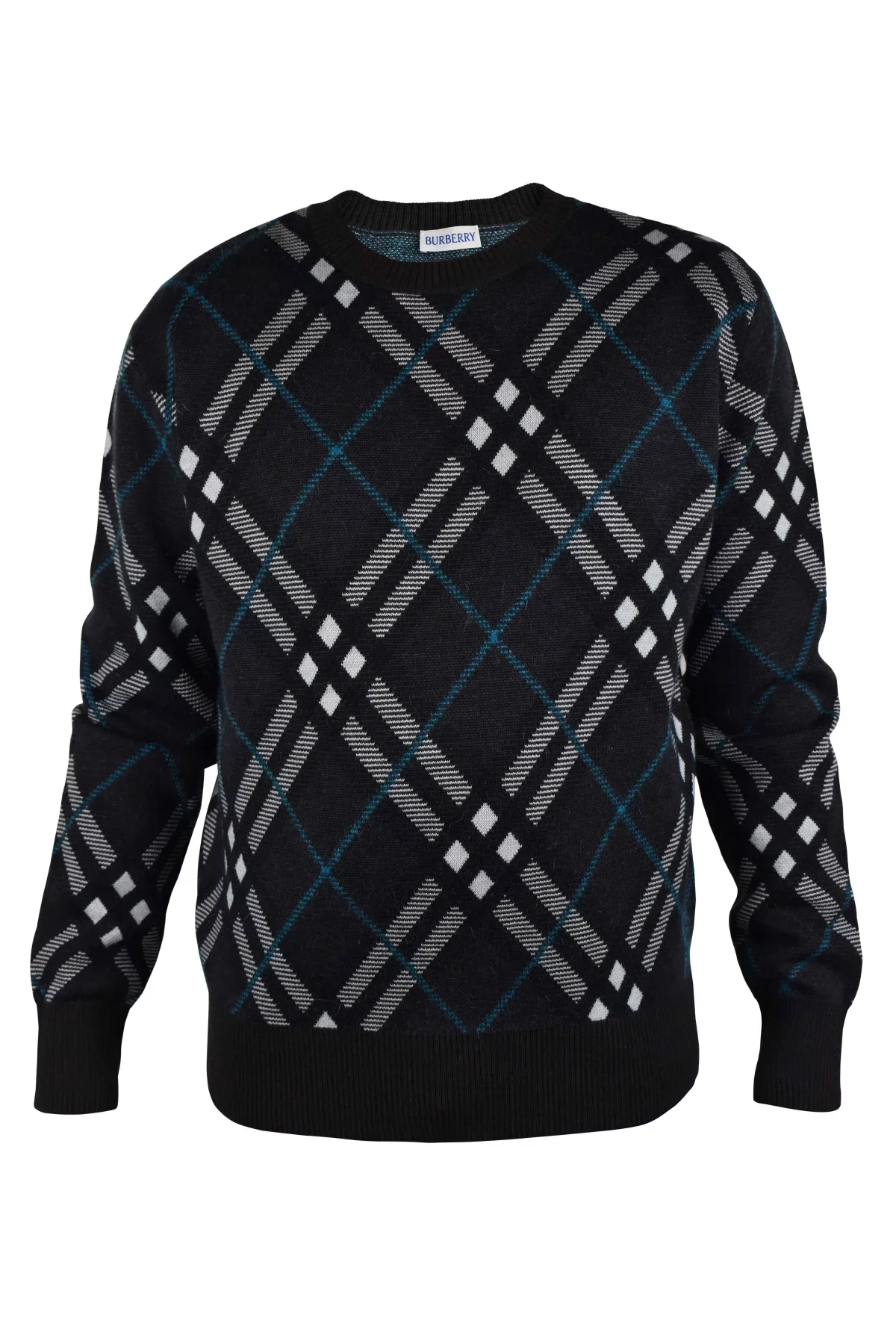 Brown/black wool sweater Burberry. Black, white and turquoise check pattern throughout. Round neck. Ribbed edges. 86% wool, 7% mohair, 8% polyamide and 1% elastane.