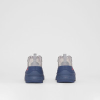 PRODUCT DETAILS Our runway sneaker crafted in a technical blend, detailed with piping and a logo appliqué. The style is capped with a matte overshoe inspired by rain boots and a cross-detailed tread referencing our iconic check. Upper: 81% polyester, 11% polyamide, 4% cotton, 3% polyurethane, 1% fibreglass Trim: 70% polyamide, 30% polyester Lining: 54% polyester, 32% goat suede, 14% sheep leather Sole: 100% polyurethane Lace-up closure Silicone patch with raised Burberry lettering at tongue, embossed Burberry lettering at heel Made in Italy 80455391