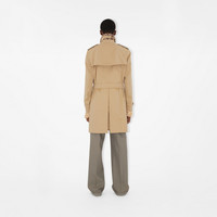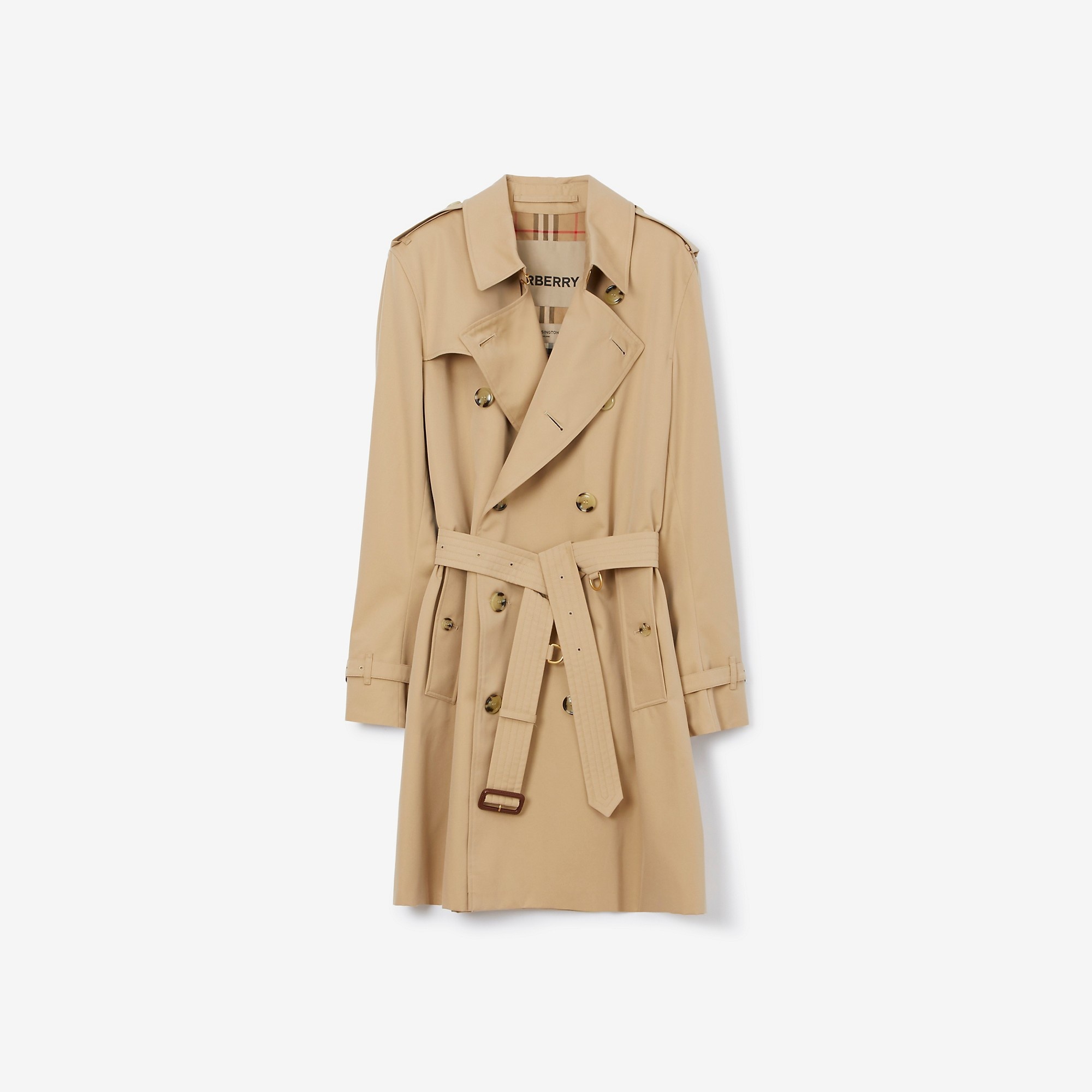 Product Details The iconic Burberry trench coat, made in England from shower-resistant cotton gabardine. Inside is Burberry Check cotton, used to line our coats since the 1920s. Part of the Heritage Collection, the Kensington is cut to a regular fit with set-in sleeves. - Double-breasted button closure - Hook-and-eye collar closure - Throat latch - Epaulettes - Belt - Side button welt pockets - Belted cuffs - Back button vent - Burberry Check lining and undercollar - Regular fit. Fits true to size, take your normal size. - *Containing organic cotton - Item 80793881 Size & Fit - Length: 100cm/39.4in (size IT 54) - Model's height: 185cm/6ft 1in. Model wears size IT 54 Fabric & Care - Outer: 100% cotton* - Lining: 100% cotton - Sleeve lining: 100% viscose - Buckles: 100% leather - Specialist dry clean - Made in Yorkshire, England