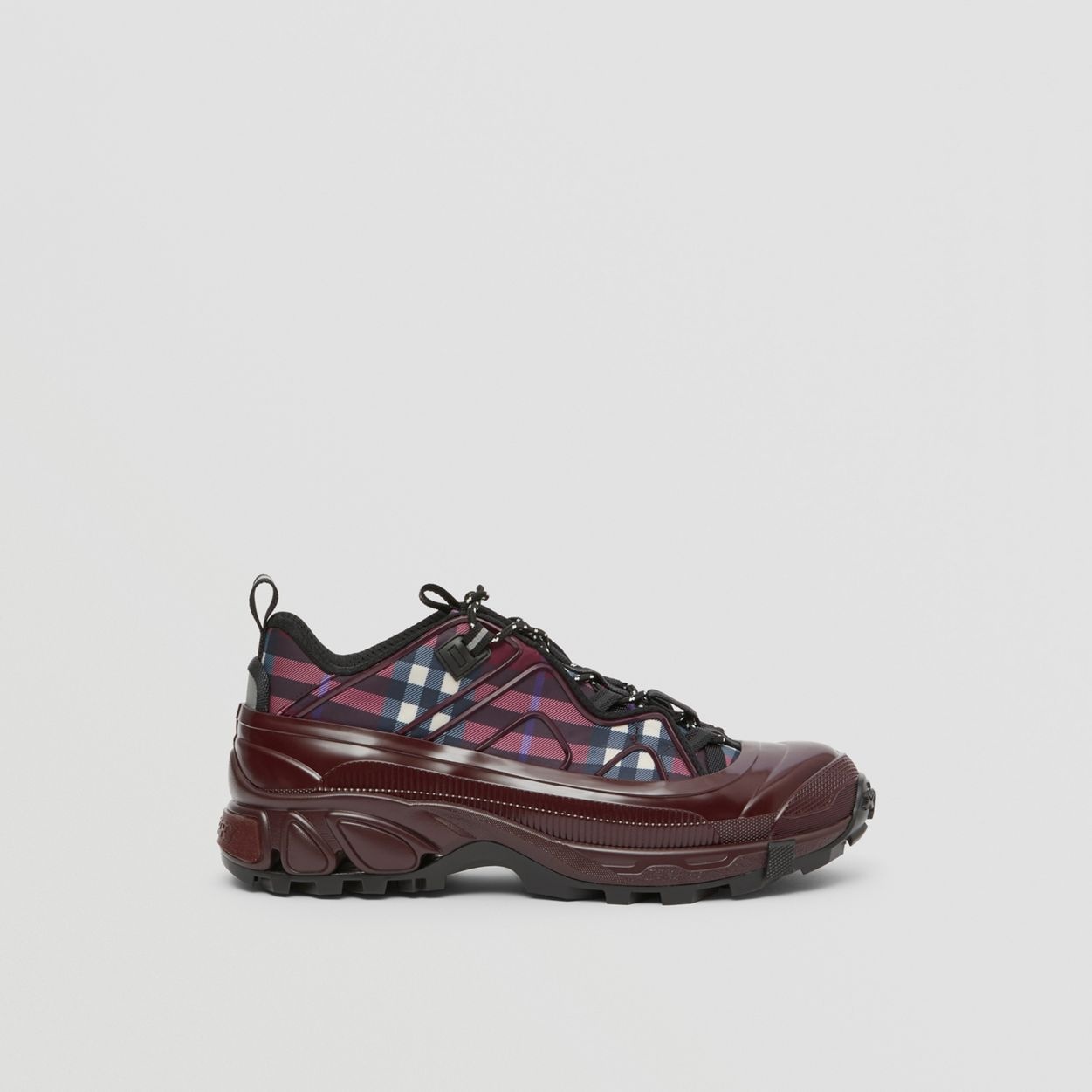PRODUCT DETAILS Our runway sneaker in Vintage Check, accented with tonal piping. The style is capped with a shiny overshoe inspired by rain boots and a cross-detailed tread referencing our iconic check. The main material of this product is made with at least 70% recycled content. Upper: 99% polyester, 1% polyamide Trim: 50% polyamide, 30% thermoplastic polyurethane, 20% polyester Lining: 62% polyester, 36% sheep leather, 2% polyurethane Sole: 100% polyurethane Lace-up closure Silicone patch with raised Burberry lettering at tongue, embossed Burberry lettering at heel Made in Italy 80555861