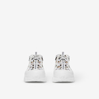 PRODUCT DETAILS Introducing our new runway sneaker crafted in Vintage check cotton and leather. The style is capped with a polished overshoe inspired by rain boots and a cross-detailed tread referencing our iconic check. Upper: 92% cotton, 8% calf leather Lining: 56% polyester, 35% sheep leather, 9% goat suede Sole: 100% polyurethane Lace-up closure Embossed Burberry lettering at heel Made in Italy Item 80372541