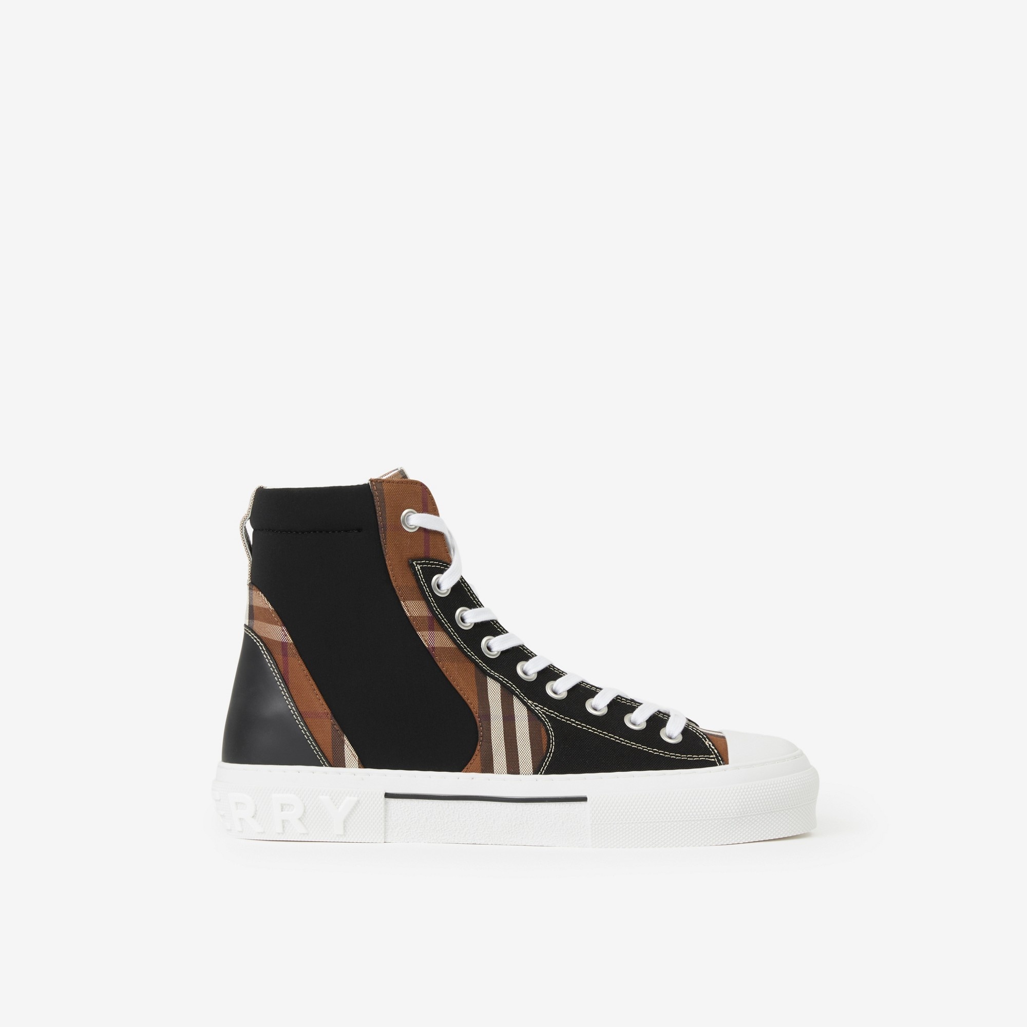 PRODUCT DETAILS High-top sneakers containing organic cotton, highlighted with Vintage Check, neoprene and smooth leather panels. The heel is accented with our logo. Upper: 75% cotton, 14% polyamide, 8% calf leather, 3% elastane Trim: 70% polyester, 30% brass Lining: 67% polyester, 16% elastane, 15% sheep leather, 2% polyurethane Sole: 100% rubber Lace-up closure Silicone patch with raised Burberry lettering at tongue, raised Burberry lettering at heel Made in Italy Item 80628321