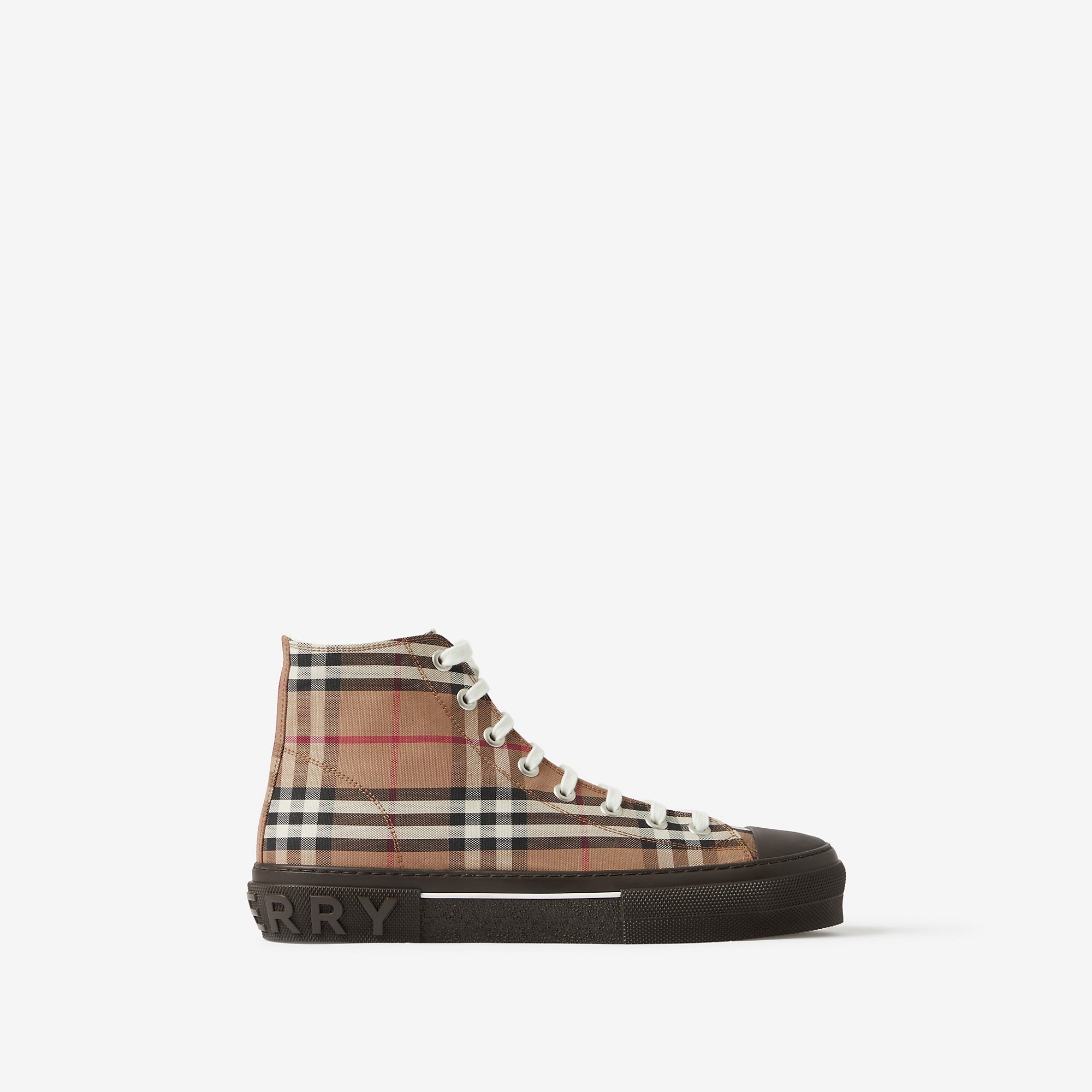 PRODUCT DETAILS High-top sneakers highlighted with our Burberry Check and embossed logo. Upper: 99% cotton, 1% calf leather* Trim: 70% polyester, 30% brass Lining: 68% cotton, 23% sheep leather, 9% goat suede Sole: 100% rubber Lace-up closure Embossed Burberry lettering at heel Made in Italy *Containing organic cotton. Item 80556611