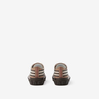 PRODUCT DETAILS Classic low-top sneakers in cotton, highlighted with our Burberry Check and logo. Upper: 99% cotton, 1% calf leather* Trim: 70% polyester, 30% brass Lining: 63% cotton, 31% sheep leather, 6% goat suede Sole: 100% rubber Lace-up closure Embossed Burberry lettering at heel Made in Italy *Containing organic cotton. Item 80568281