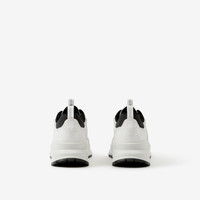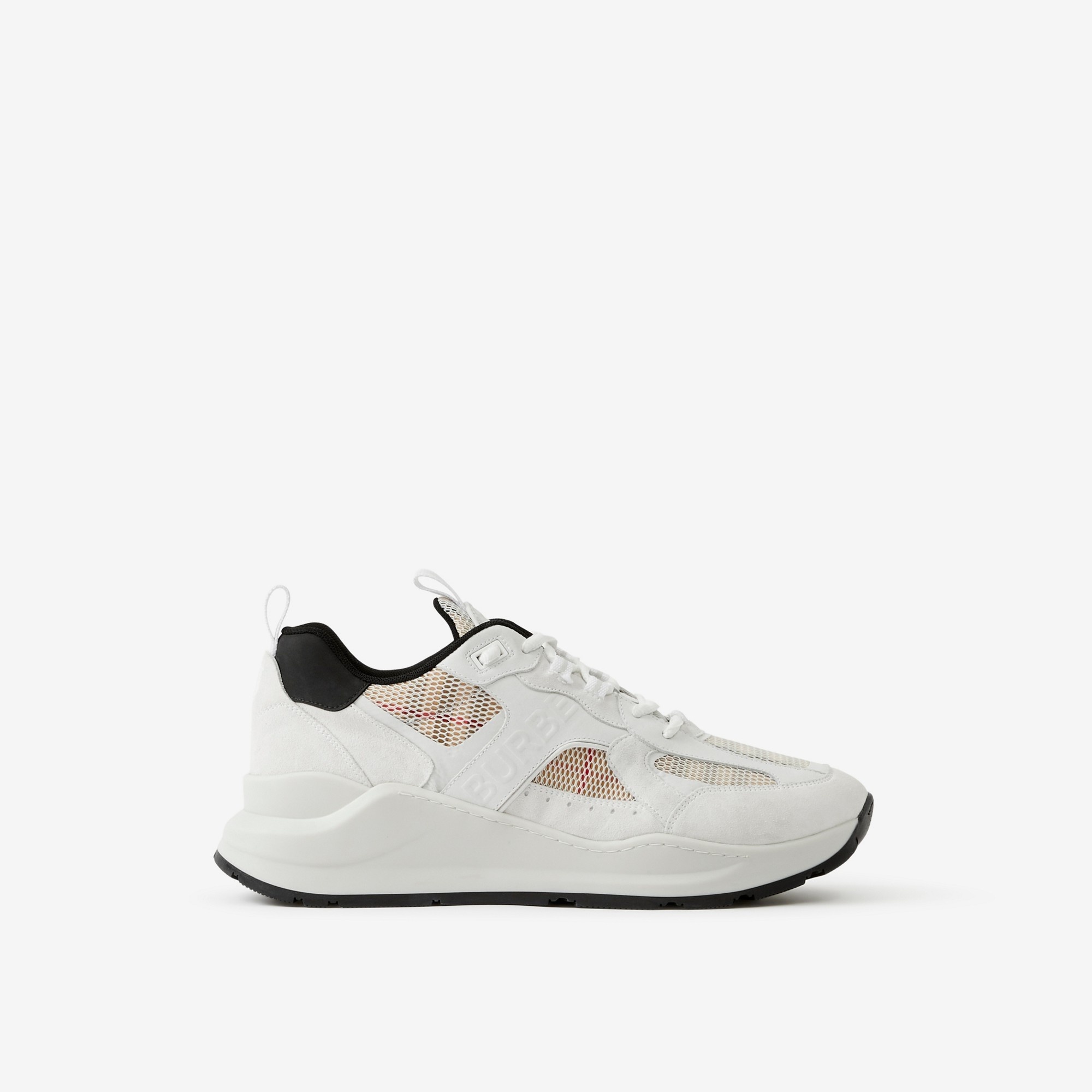 PRODUCT DETAILS A chunky sneaker panelled in suede, leather and Vintage Check cotton layered with mesh. The design is highlighted with a tonal raised logo detail and set on an accentuated, curved sole. Upper: 30% cotton, 30% polyester, 19% calf suede, 18% leather, 2% polyurethane, 1% polyamide Trim: 45% polyester, 30% polyurethane, 25% polyamide Lining: 89% polyester, 8% sheep leather, 3% polyurethane Sole: 100% rubber Lace-up closure Embossed Burberry lettering at side Made in Italy Item 80618801