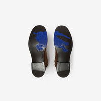 Product Details Country pursuits inform our Ledger boots, an ankle-length shape made in Italy from waxed calf suede – a new edition debuted on the Burberry Summer 2026 runway. The equestrian-inspired style features pull tabs and a B buckle strap with a matt finish. Our Equestrian Knight Design is moulded at the sole in signature Knight Blue. - Rounded toe - Equestrian Knight Design at sole - Engraved Burberry lettering at buckle - Comes with a dust bag - Item 81243571 Size & Fit - Length from top of heel to top of boot: 20.5cm/8.1in. Top circumference: 23cm/9.1in Fabric & Care - Upper: 100% calf suede - Trim: 52% zinc alloy, 42% brass, 6% copper - Lining: 95% calf leather, 5% goat suede - Sole: 70% calf leather, 30% thermoplastic polyurethane - Made in Italy