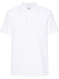 logo-embroidered polo shirt Subtle nods to Burberry's heritage elevate this classic pique polo. The founder Thomas Burberry's monogram is discreetly embroidered on the chest, while the button placket is lined with the house's iconic Vintage Check. Highlights - White - Cotton - Pique weave - Embroidered logo at the chest - Polo collar - Front button placket - Short sleeves - Ribbed cuffs - Short side slits - Straight hem Imported Composition Cotton 100% Washing instructions Machine Wash