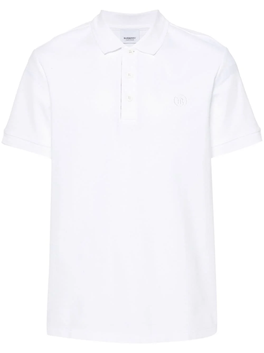 logo-embroidered polo shirt Subtle nods to Burberry's heritage elevate this classic pique polo. The founder Thomas Burberry's monogram is discreetly embroidered on the chest, while the button placket is lined with the house's iconic Vintage Check. Highlights - White - Cotton - Pique weave - Embroidered logo at the chest - Polo collar - Front button placket - Short sleeves - Ribbed cuffs - Short side slits - Straight hem - We've partnered with good on you — an independent agency that rates how brands perform in relation to their impact on the planet, people and animals, with a multi-criteria rating simplified to a five points scale. in order to be awarded our conscious label, larger brands need to score a minimum of four out of five ('good'), while smaller brands must score at least three out of five ('it's a start'). - This item comes from a brand rated three out of five ('it's a start') by good on you at the time it was added on farfetch. please note, this is a brand-level rating and does not guarantee that this product is made with conscious materials. - Learn more about what makes a product conscious on our conscious criteria page Imported Composition Cotton 100% SIZE & FIT Model measurements Height 6 ft 2 in(1.87 m) Bust/Chest 36.61 in(93 cm) Hips 35.82 in(91 cm) Waist 29.13 in(74 cm) FittingInformation Designed for a relaxed fit, this polo shirt offers comfort and movement Made from a midweight non-stretch fabric, this piece offers minimal elasticity when worn This piece fits true to size – take your usual size