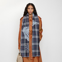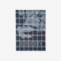 Product Details A wide scarf made in Italy from lightweight wool silk, designed for year-round wear. The style is jacquard-woven with our Equestrian Knight Design, logo and the Burberry Check in a seasonal ink blue colourway. - Rectangular - Eyelash fringing at the edges - Item 81179021 Size & Fit - 200 x 70cm/78.7 x 25.6in Fabric & Care - 52% wool, 48% silk - Dry clean - Made in Italy