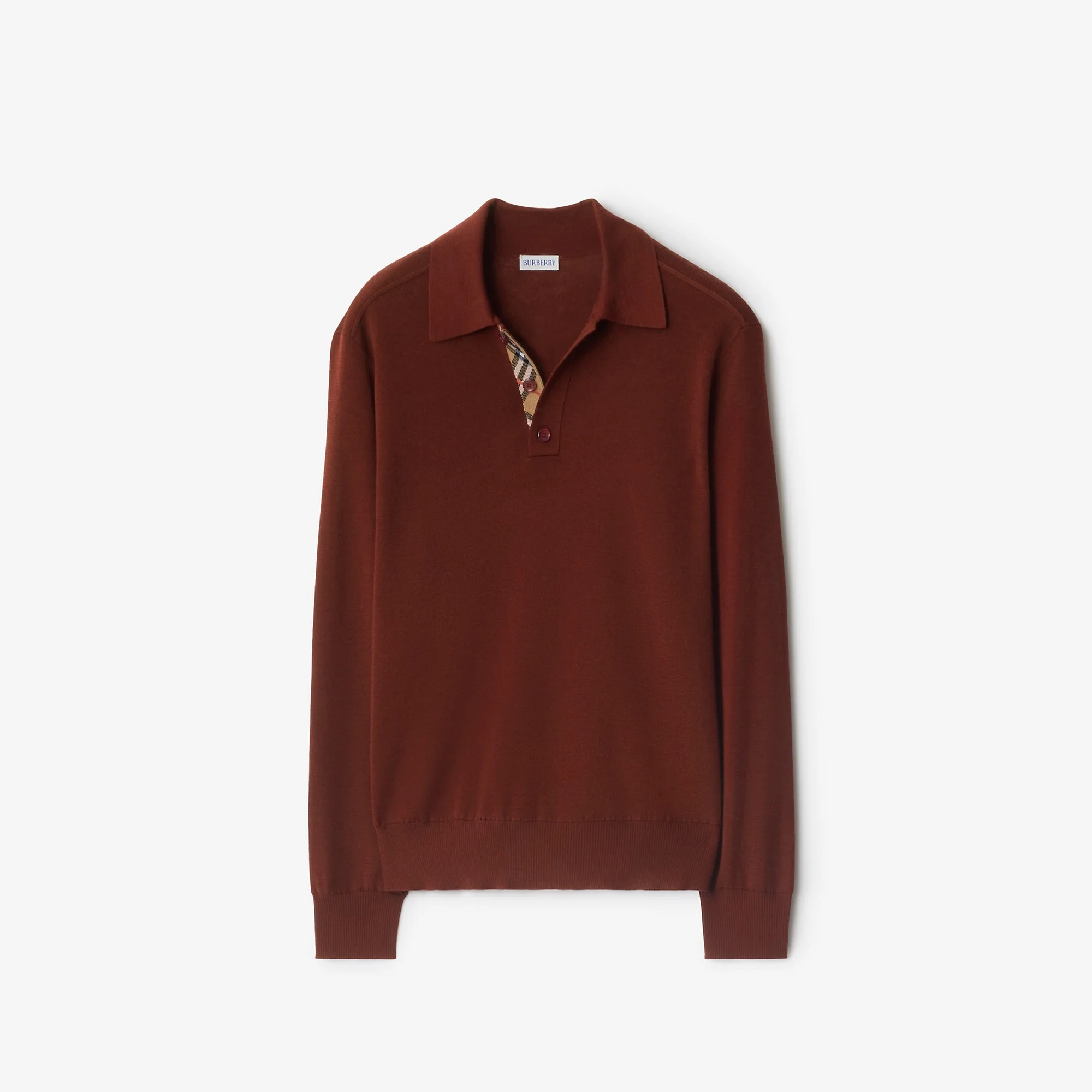 Product Details A long-sleeved polo shirt made from Italian-knitted wool. The style is cut to a slim fit and lined with Burberry Check at the placket in our signature sand colourway. - Button placket - Rib-knit trims - Slim fit: this style is cut to a fitted silhouette. Fits true to size, take your normal size. - Item 81121451 Size & Fit - Length: 65.5cm/25.7in (size UK M) - Model's height: 188cm/6ft 2in. Model wears size UK M Fabric & Care - 100% wool - Trims: 81% wool, 16% polyamide, 3% elastane; 98% wool, 1% elastane, 1% polyamide; 91% cotton, 8% polyamide, 1% elastane; 90% wool, 8% polyamide, 2% elastane - Buttons: mother-of-pearl - Specialist dry clean - Imported