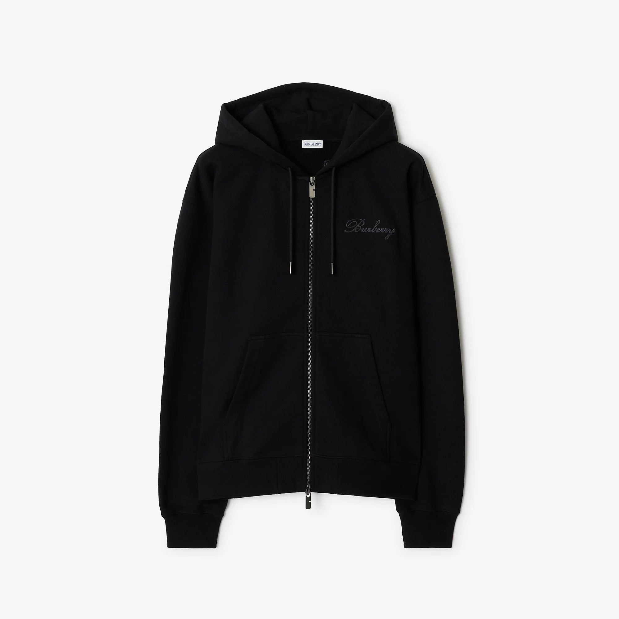 Product Details A zip hoodie cut to a relaxed fit from lightweight loop-back cotton. The design features a cursive logo in chain-stitch embroidery filled with the Burberry Check. - Two-way zip closure - Drawcord hood - Rib-knit trims - Embroidered Burberry lettering at chest and back - Relaxed fit: a looser cut than our regular fit. - Machine wash - Item 81191841 Size & Fit - Length: 72cm/28.4in (size UK L) - Model’s height: 184cm/6ft. Model wears size UK L Fabric & Care - 100% cotton - Trim: 99% cotton, 1% elastane; 100% cotton - Made in Portugal