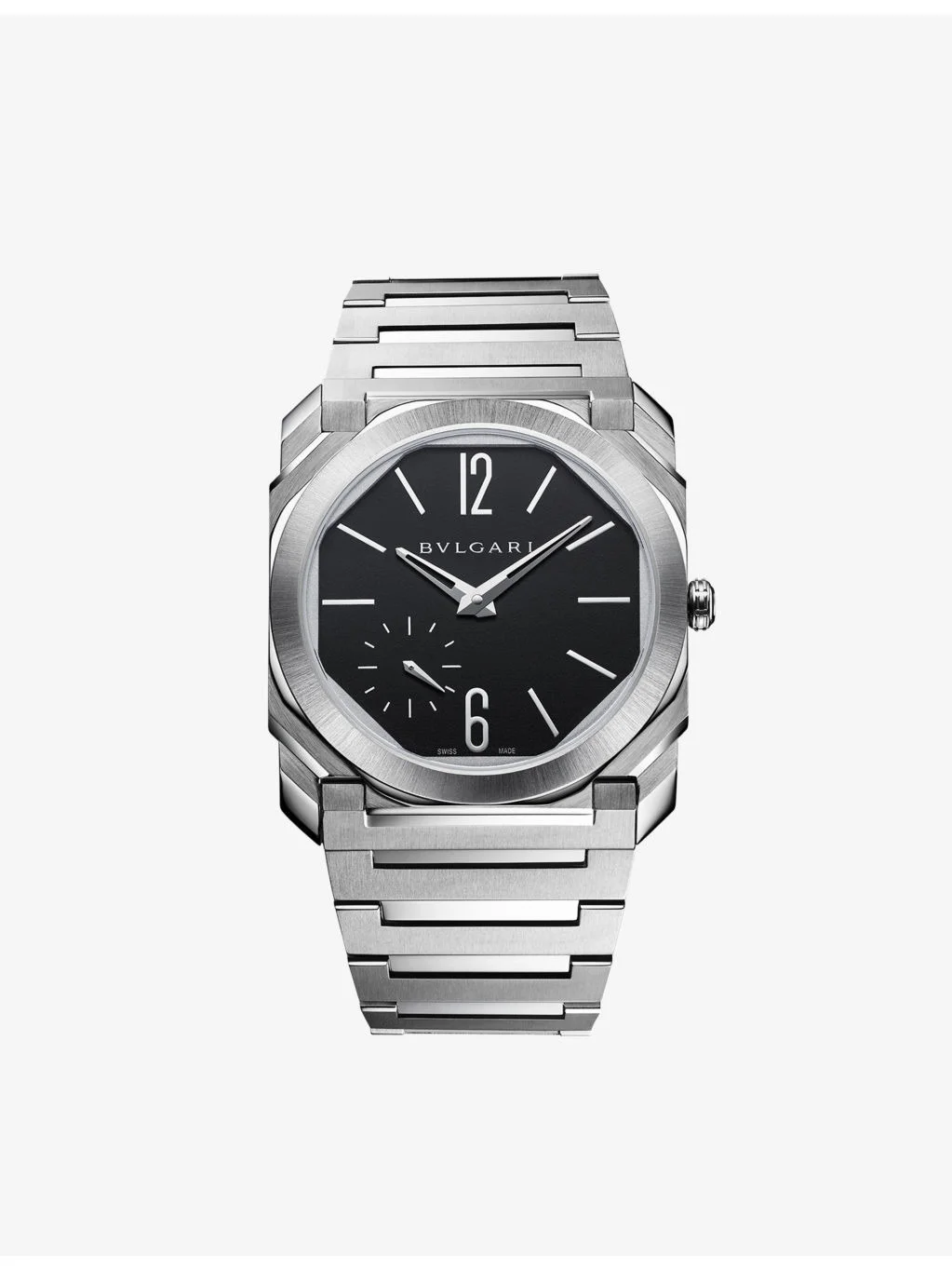 PRODUCT DETAILS - Bvlgari BGO40BPSSXTAUTO Octo Finissimo stainless-steel automatic watch - 100% 18ct rose gold, 100% sterling silver - Style number: BGO40BPSSXTAUTO - Folding-clasp fastening - Automatic watch with mechanical manufacture movement, automatic winding, platinum micro rotor and small seconds. BVL 138 calibre, extra-thin satin-polished stainless steel case, transparent case back, polished stainless steel screw-down crown set with ceramic insert, black matte dial and integrated satin-polished stainless steel bracelet with folding clasp - Dial: octagonal - Glass: synthetic sapphire - Case diameter: 40mm - Case thickness: 6.40mm - Water resistance: more than 10 bar / 10 atm / 100m - Made in Switzerland - Please refer to the brand’s care instructions - 5-year warranty - Bvlgari prides itself on providing excellent customer service. This includes contacting customers to offer after-sales care and share details about its brand and products. As such, when you order a Bvlgari product from us, your details will be passed onto Bvlgari so that it can provide these services to you Ref: R04319478