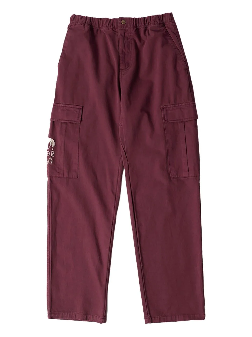 Again embroidered cargo trousers Highlights - Burgundy red - Side cargo pockets - Embroidered motif - Elasticated waistband - Side slit pockets Imported Composition Cotton 100% Washing instructions Read Manufacturer Guidelines