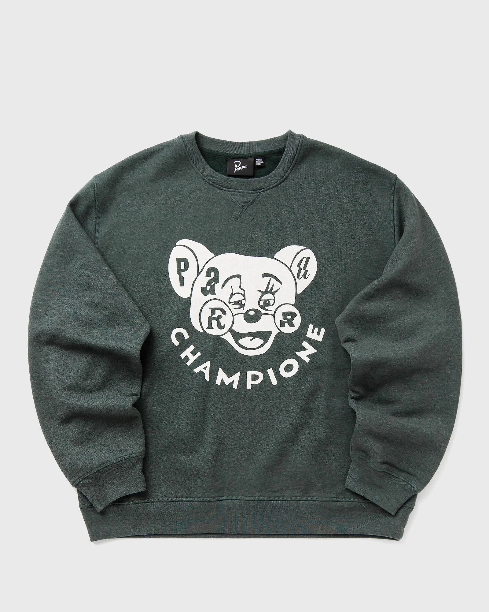 The product By Parra - TIRED CHAMPIONE CREW NECK SWEATSHIRT in the color Pine Green is available at BSTN. Article number: 55130 Gender: men Color: Pine Green Material: 83% Cotton, 17% Polyester