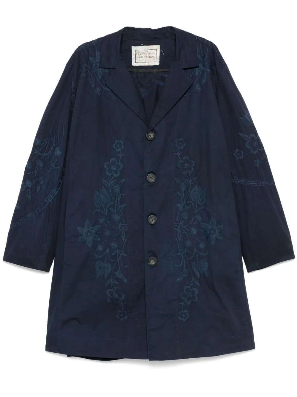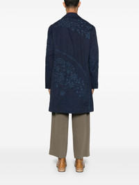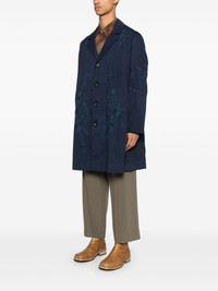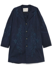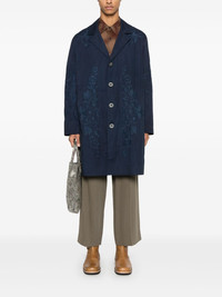 embroidered cotton coat Highlights - Indigo blue - Front button fastening - Two side slit pockets - Notched lapels - Long sleeves Made in United Kingdom Composition Cotton 100% SIZE & FIT Model measurements Height 6 ft 2 in(1.87 m) Bust/Chest 38.18 in(97 cm) Hips 36.61 in(93 cm) Waist 29.13 in(74 cm) FittingInformation Designed to be unstructured, offering a loose fit throughout Made from a midweight non-stretch fabric