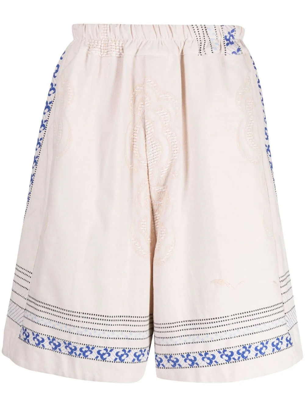 floral-embroidered linen drop-crotch shorts Highlights - Powder pink - Linen/flax - All-over motif embroidery - All-over floral embroidery - Panelled design - Above-knee length - Two side slash pockets - Two rear patch pockets - Elasticated waistband Made in United Kingdom Composition Linen/Flax 100%