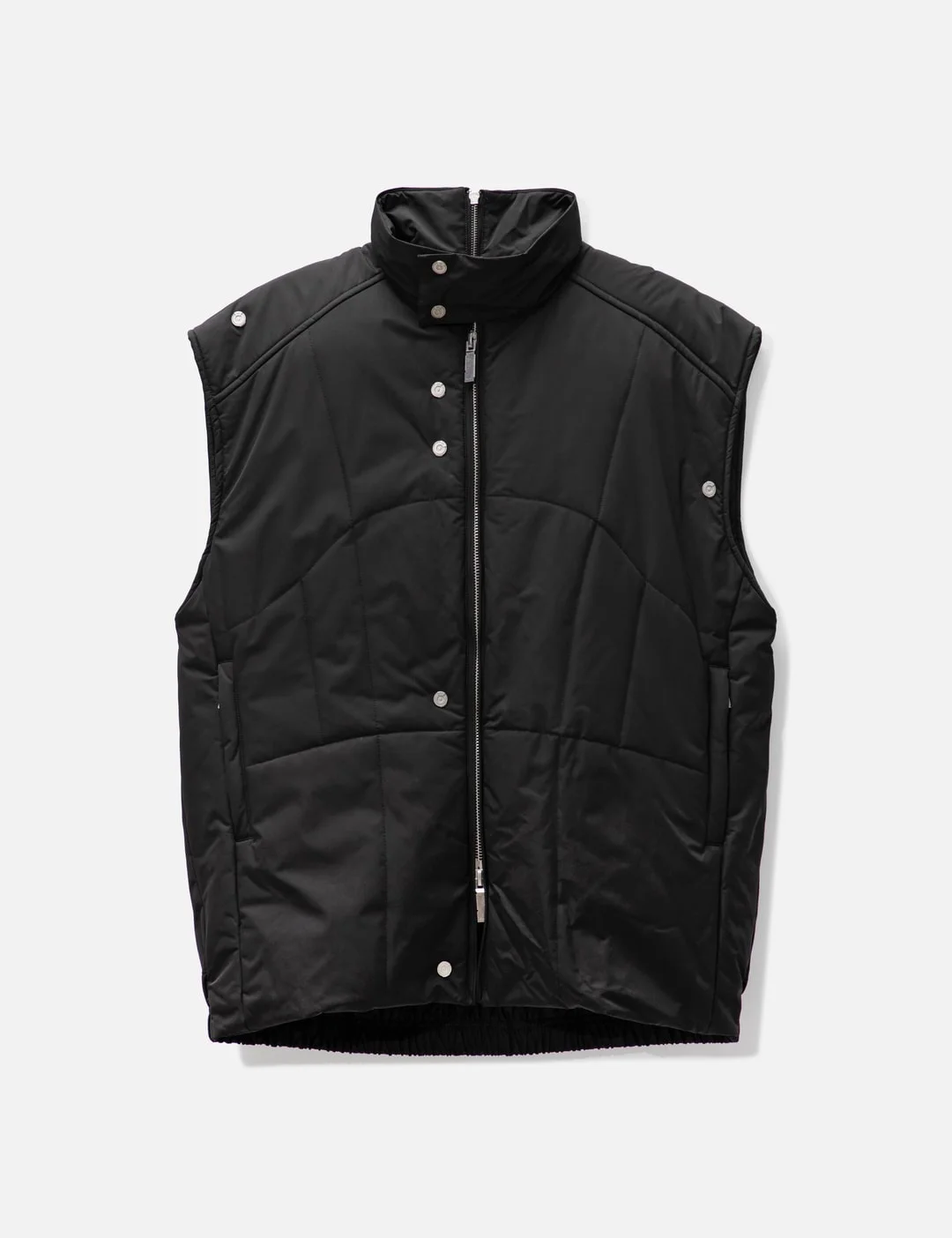 - C2H4 - 004 - Oversizing Asteroid Padded Vest - Mock neck with snap-button flap - Padded construction - Sleeveless - Zip closure with two-way zipper - Two zipped side pockets - One zipped inner pockets - Two logo engraved D-ring at the inner - Metal button details throughout - Branding embroidery on the rear waist - Zip design at the yoke - Elasticated hem - Color: Black - Material: 100% Polyester; 100% Cow Leather - See more Vests and Clothing SIZING - Model wears size S - Model measures: Height 185cm, Chest 33”/83cm, Waist 25”/64cm, Hip 35”/89cm