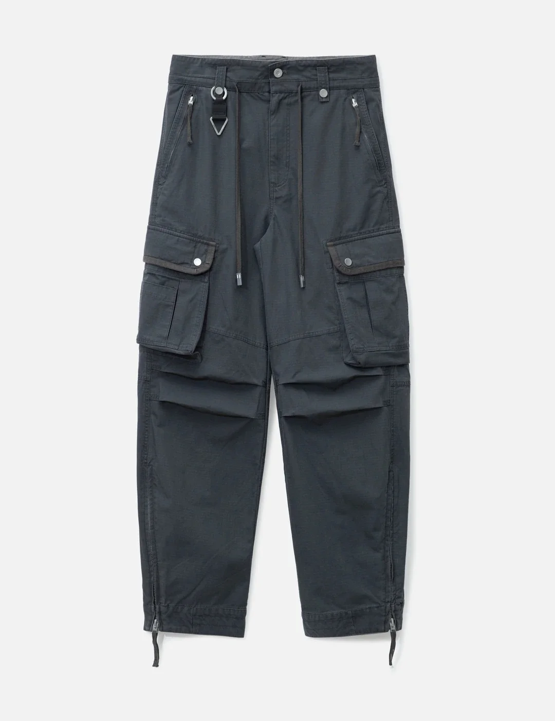 - C2H4 - Muddy Work Pants - Weighty cotton ripstop fabric - Zip closure - Logo embossed keyring on belt loop - Four side pockets; two rear pockets - Two cargo pockets - Zippers at hem - Color: Volcano Gray - Material: 100% Cotton - See more Pants and Clothing SIZING - Model wears size M - Model measures: Height 188cm, Chest 36"/92cm, Waist 30"/76cm, Hip 37"/94cm