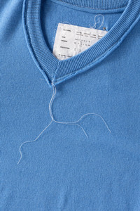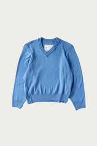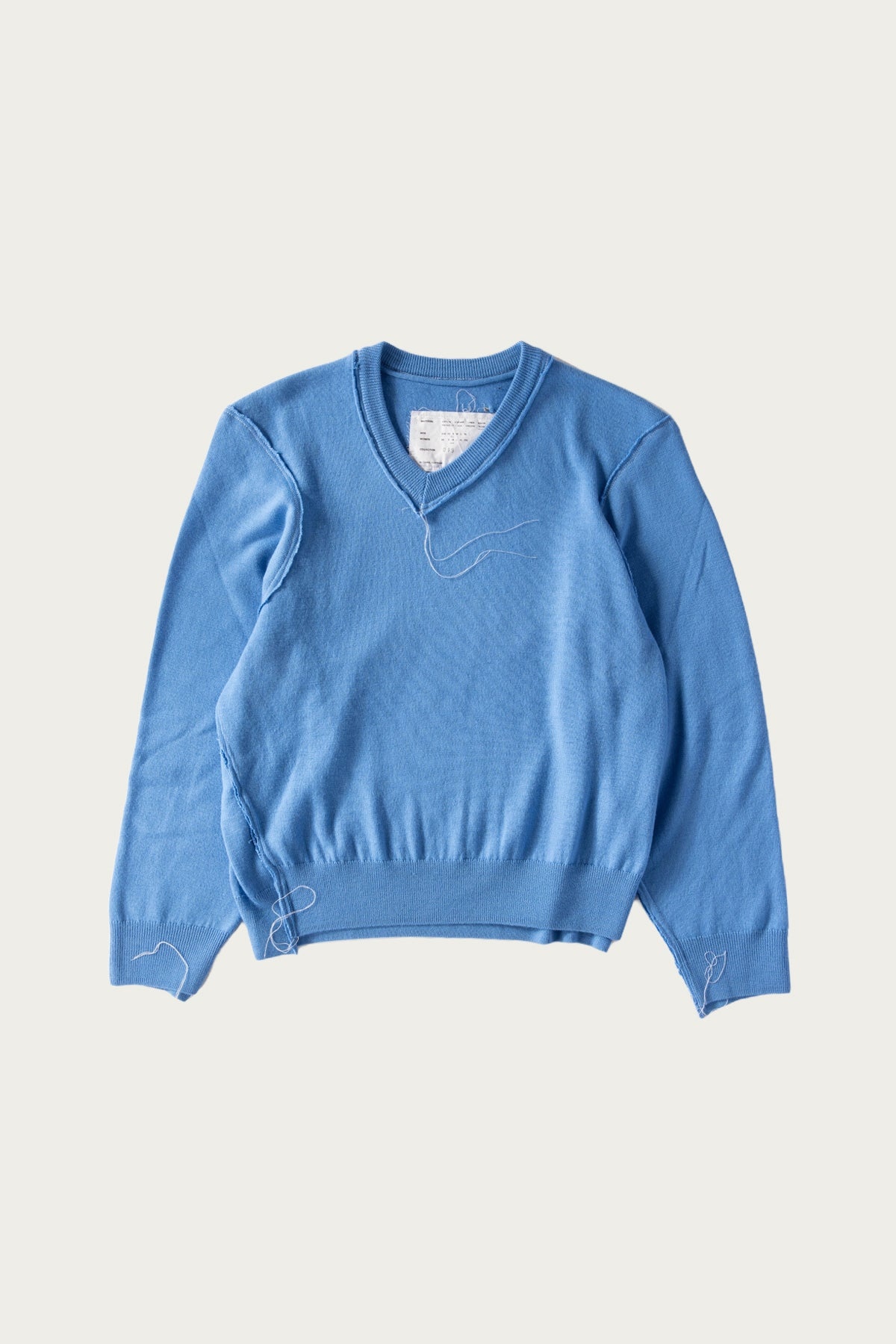 The Frankenstein V-Neck in Blue is expertly crafted from 100% cashmere, providing a luxurious and comfortable fit. The rib knit V-neck, droptail hem, and cuffs add a touch of sophistication, while the contrast stitching in white offers a unique and modern twist. This knit sweater features rolled edges, loose threads, and exposed seams for a stylishly distressed look. Elevate your wardrobe with this blue cashmere piece. - 100% Cashmere - Dropped shoulders - Contrast stitching - Blue