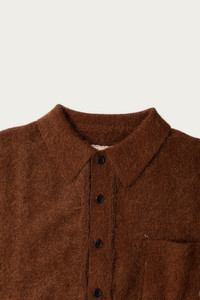 A playful take on the classic mohair cardigan, this version leans fully into the fuzzy feel. Knit from a dense brown mohair wool blend, it holds warmth while feeling light on the shoulders. The color has depth, texture, and character that shifts slightly with the light-- easy to dress up but even better when thrown on over something simple and worn-in. - 79% wool, 19% polyamide, 2% elastane - Brown mohair/wool blend with a bold, hairy finish - Relaxed cut with raw-edge detailing throughout - Button closure and classic spread collar