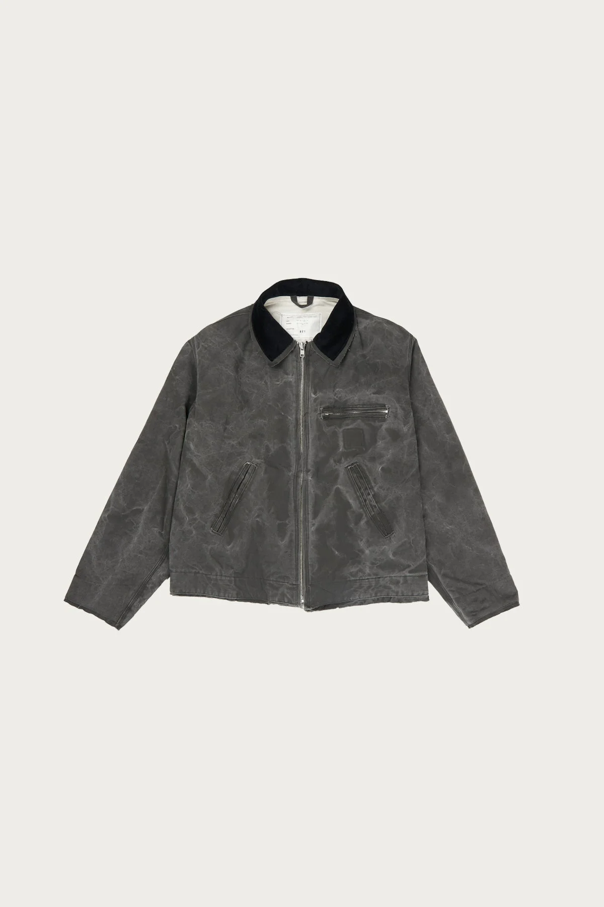 A familiar shape pushed slightly off center, reworked in a deep black with a vintage wash that reveals highs and lows across the surface. The fabric has weight, but the finish gives it movement. Raw edges and slight distortion in the cut keep things intentionally imperfect. Pairs naturally with dark trousers or washed denim. Layer over tonal pieces to let the texture do the work.
