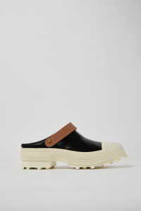 Black vulcanized calfskin leather Mary Jane clogs with brown slingback straps, OrthoLite® Recycled™ footbeds, and white toothed rubber outsoles. Features Upper Calfskin leather/ PU / Rubber Color Black-White-Brown Outsole/Features Rubber Insole OrthoLite® Recycled™ Lining 67% Textile (45% Recycled Polyester - 35% Recycled Cotton - 20% Viscose) 29% Leather 4% Recycled Polyester