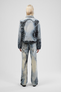 Blue-black jacket in premium Italian Candiani denim with CAMPERLAB's signature distorted print. Features Material 100% Organic Cotton (76% organic cotton - 24% upcycled postconsumer waste) Color Blue / Black Features Relaxed unisex fit Two buttoned chest pockets Two slash body pockets Adjustable waist button Size and Fit Unisex For a more fitted look, choose 1 - 2 sizes smaller than your regular size. Sleeves may be long on smaller frames. Male model is 191 cm and wearing size M Female model is 178 cm and wearing size XS