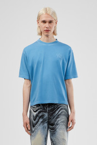 Blue mineral-dyed 100% organic cotton T-shirt with cut-out neck detail at back. Features Material 100% Organic Cotton Color Gray Features Cropped length Tonal logo embroidery at chest Size and Fit Unisex For a more cropped look, size down. Male model is 191 cm and wearing size M Female model is 178 cm and wearing size S