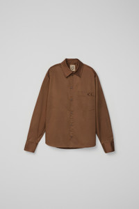 Brown shirt made from heavyweight Italian cotton with a satin finish, featuring a relaxed silhouette that enhances the classic button-up. Features Material 94% Cotton / 6% Elastane Color Brown Features Heavyweight Italian cotton fabric with satin construction and shiny effect Relaxed fit Patch pocket at chest with embroidered logo Adjustable sleeve buttons Size and Fit Unisex Male model is 185 cm and wearing size M Female model is 175 cm and wearing size M