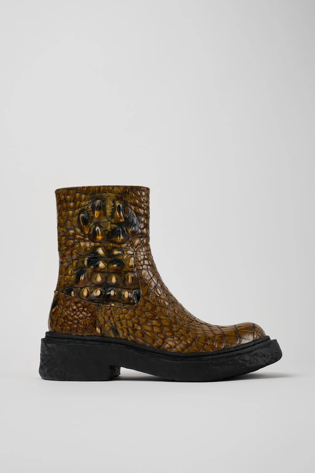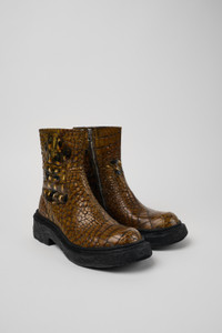 Brown leather zip boots with an embossed crocodile effect, OrthoLite® Recycled™ footbeds and PU outsoles. Features Upper 100% Leather (LWG gold certified) Color Brown Outsole/Features 100% PU Insole - OrthoLite® Recycled™ Footbed Lining 83% Leather, 17% Recycled Polyester