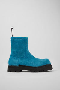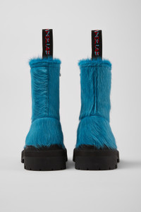Blue long calf hair boots with rubber outsoles. Features Upper Calfskin (Leather Working Group Certified) Color Blue Outsole/Features Rubber / EVA Side zip Insole OrthoLite® for cushioning Lining 73% calfskin 27% recycled polyester
