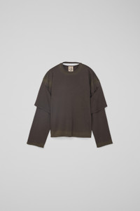 Faded black organic cotton layered long sleeve T-shirt with cut-out details. Featuring hand-applied spray placement for a unique finish. Features Material Organic Cotton Color Faded black with hand-applied spray placement Size and Fit - Relaxed fit - Wide neckline - Clean, structured lines - Dropped shoulder - Non-detachable sleeve layers layers