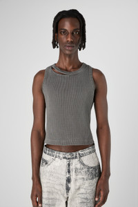Faded black Ribbed Tank Top in 100% mineral-dyed organic cotton. Features Material 100% Organic Cotton Color Faded Black Features Heavyweight ribbed fabric Cut out neck collar detail at the front Cut-out neck collar detail at front Cut out straps detail at the back Cut-out strap detail at back Size and Fit Size and Fit Unisex Fitted Male model is x cm and wearing size Female model is x cm and wearing size