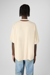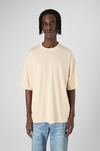 Faded sand crewneck t-shirt with a unique cut-out neck detail. Made from a blend of PYRATEX® certified organic cotton and circulose fiber, sourced from post-consumer textile waste, this fabric is crafted using renewable energy. A perfect blend of style and sustainability Features Material 50% Organic Cotton / 50% Viscose (CIRCULOSE®) Color Faded Sand Features Crew neck Cut-out neck collar detail at back Washed look Size and Fit Boxy unisex fit Male model is 185 cm and wearing size M Female model is 177 cm and wearing size XS