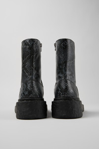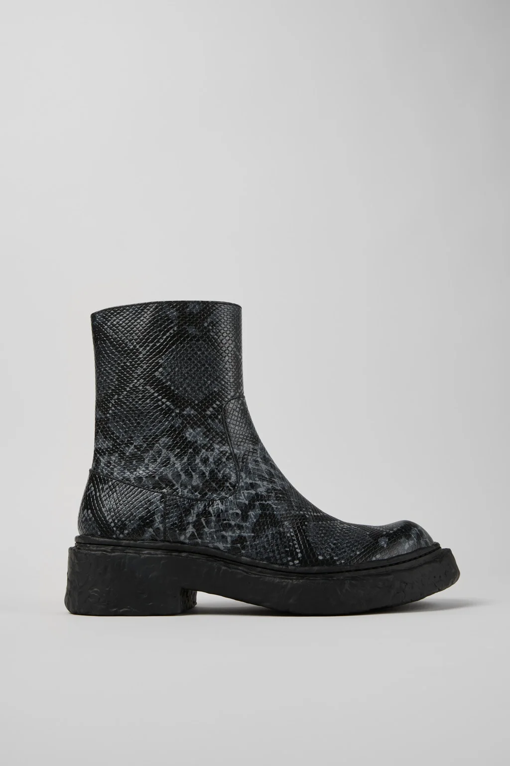 Gray-Black leather zip boots with embossed snake effect, OrthoLite® Recycled™ footbeds and PU outsoles. Features Upper Leather (embossed snake effect) Color Gray Outsole/Features 100% PU Insole OrthoLite® Recycled™ Non-Removable Footbed Lining 83% Leather, 17% Recycled Polyester