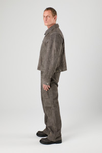 Gray jacket featuring intentionally distressed suede leather, offering a unique, vintage-inspired look that will continue to develop character and wear out beautifully over time. Features Material Body: 100% Bovine Leather Suede Lining: 100% Polyester Color Gray Features Finished suede with wrinkled effect and soft, full hand feel Relaxed unisex fit Two buttoned chest pockets Two slash body pockets Adjustable waist button Size and Fit Unisex Male model is 191 cm and wearing size 28 Female model is 178 cm and wearing size 28