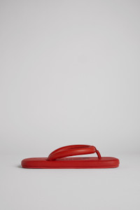 Red leather flip-flop sandals with squared design and memory foam footbed. Comes with split-toe tabi socks made of embossed organic cotton in matching color. Features Upper Calfskin Color Red Outsole/Features Rubber Lining 100% Calfskin A Little Better Leather Working Group Certified