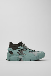 Ice blue caged sneakers with gray water-repellent 3D-knitted recycled PET sock interiors featuring a gradient print, direct injection TPU exteriors, and recycled PU outsoles. Fully recyclable. Features Upper Textile / Synthetic Color Gray Outsole/Features PU / TPU Insole PU Removable Footbed Lining 80% Textile (75% Recycled Polyester - 14% Hilo PU - 11 Spandex) 20% Recycled Polyester