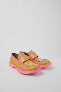Pink and green leather loafers with rubber outsoles. Features Upper Calfskin (Leather Working Group Certified) Color Pink / Green Outsole/Features Rubber / Natural rubber / Recycled rubber Insole OrthoLite® for cushioning Upper 73% calfskin 27% textile (45% recycled polyester - 35% recycled cotton - 20% viscose)
