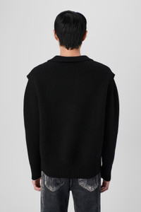 Black full-needle knitted wool-blend polo sweater with cut-out details. Features Material Wool Blend Color Black Size and Fit - Relaxed fit, slightly boxy silhouette - True to size for slightly oversized look - Below waist length for balanced proportion - Wide polo-style collar with open placket