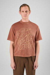 Terracotta T-shirt in 100% mineral-dyed organic cotton with cut-out detail at back and seasonal print. Features Material 100% Organic Cotton Color Terracotta Features Cropped length Printed scribbled logo artwork at front Cut-out neck detail Size and Fit Unisex For a more cropped look, size down. Male model is x cm and wearing size Female model is x cm and wearing size