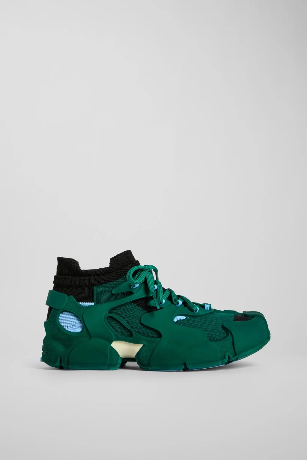 Green and black caged sneakers with water repellent 3D-knitted PET sock interiors, direct injection TPU exteriors, and recycled PU outsoles. Fully recyclable. Features Upper Textile / Synthetic Color Green Outsole/Features PU / TPU Insole PU Upper 80% textile (75% recycled polyester - 14% Hilo-PU - 11% spandex) 20% recycled polyester