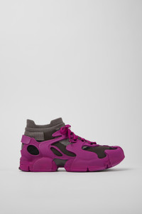 Purple caged sneakers with water-repellent 3D-knitted PET sock interiors, direct injection TPU exteriors, and recycled PU outsoles. Fully recyclable. Features Upper Textile / Synthetic Color Purple Outsole/Features PU / TPU Insole PU Lining 80% textile (75% recycled polyester - 14% Hilo PU - 11 spandex) 20% recycled polyester