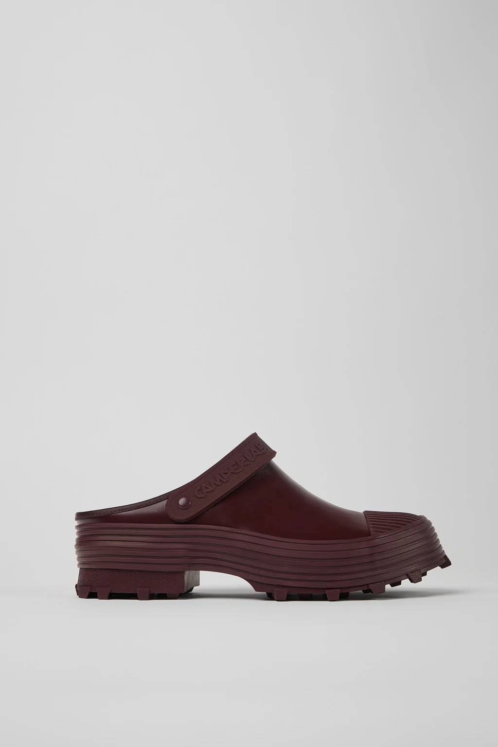 Burgundy vulcanized leather clogs with slingback straps, OrthoLite® Recycled™ footbeds and toothed rubber outsoles. Features Upper Leather/ PU / Rubber Color Burgundy Outsole/Features Rubber Insole OrthoLite® Recycled™ Lining 67% textile (45% recycled polyester - 35% recycled cotton - 20% viscose) 29% leather 4% recycled polyester