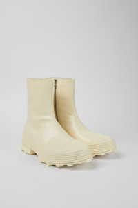 White vulcanized leather zip boots with toothed rubber outsoles and recycled OrthoLite® cushioned footbeds. Features Upper Calfskin / Rubber Color White Outsole/Features 100% Rubber Insole - OrthoLite® Recycled™ Footbed Lining 64% Textile (45% Recycled Polyester, 35% Recycled Cotton, 20% Viscose), 19% Calfskin, 17% Recycled Polyester