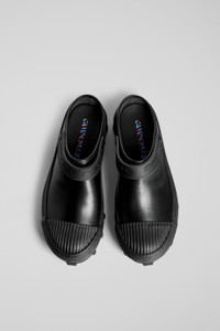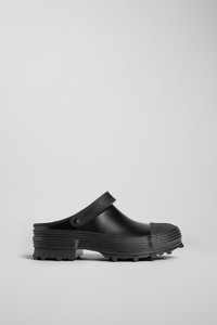 Black vulcanized leather clogs with slingback straps and toothed rubber outsoles. Features Upper Calfskin / PU / Rubber Color Black Outsole/Features 100% Rubber Insole OrthoLite® for cushioning Upper 67% textile (45% recycled polyester - 35% recycled cotton - 20% viscose) 30% calfskin 3% PU