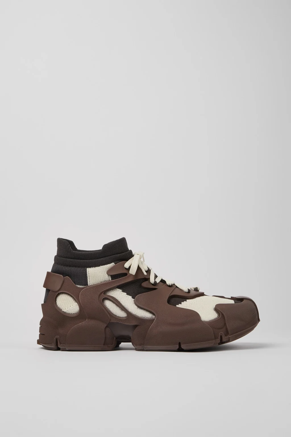 White-Gray caged sneakers with water-repellent 3D-knitted recycled PET sock interiors, direct injection TPU exteriors, and recycled PU outsoles. Fully recyclable. Features Upper Textile / Synthetic Color Brown / White Outsole/Features PU / TPU Insole PU Removable Footbed Lining 80% textile (75% recycled polyester - 14% Hilo PU - 11 spandex) 20% recycled polyester