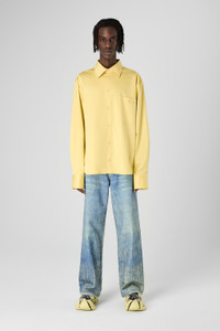 Yellow shirt made from heavyweight Italian cotton with a satin finish, featuring a relaxed silhouette that enhances the classic button-up. Features Material 94% Cotton / 6% Elastane Color Yellow Features Heavyweight Italian cotton fabric with satin construction and shiny effect Shirt collar Patch pocket at chest with embroidered logo Adjustable sleeve buttons Size and Fit Unisex Relaxed fit Male model is 185 cm and wearing size M Female model is 175 cm and wearing size M